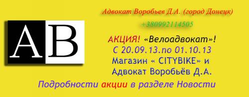 Реклама совместной акции адвоката и магазина по продаже и аренде велосипедов проводимой осенью 2013 года в городе Донецке. Картинка была расположена на главной странице официального сайта адвоката Донецка Воробьева Д.А. 0992114505